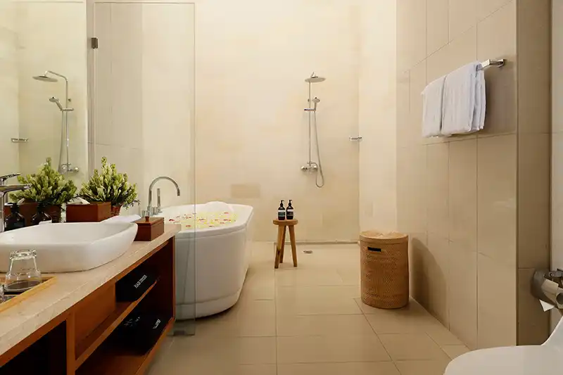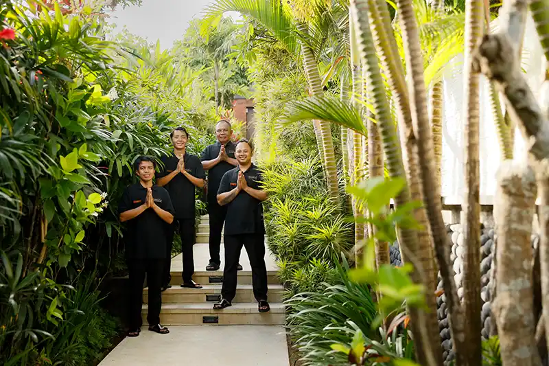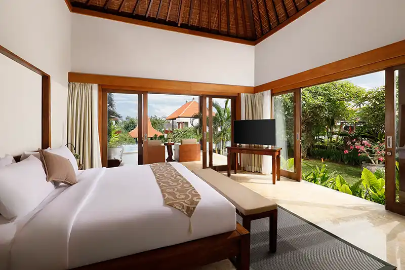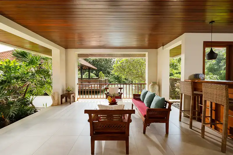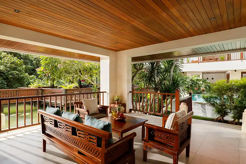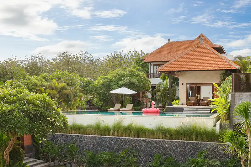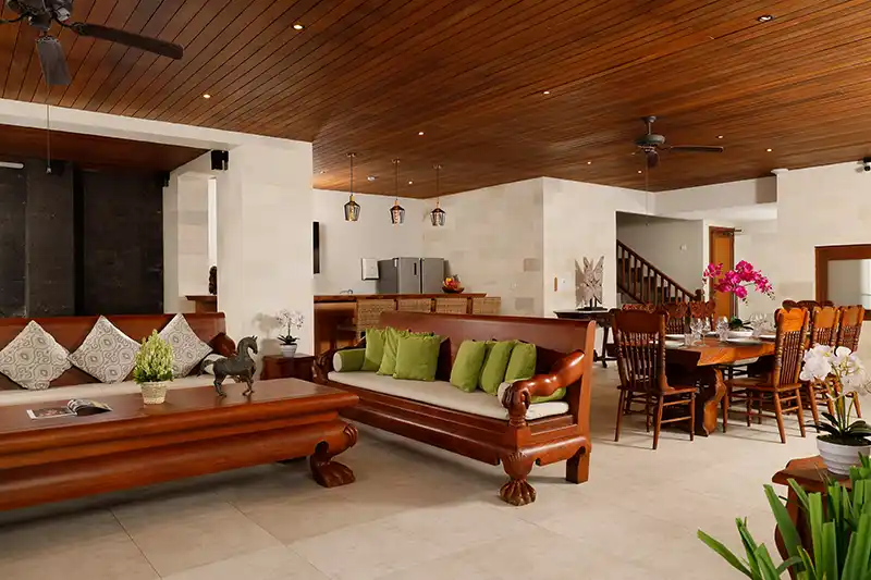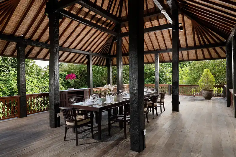 As you explore the surroundings of the 6-bedroom villa, you’ll encounter meticulously landscaped greenery that enhances the serene ambiance around the inviting swimming pool and joglo area. Ascend a charming staircase to reach the joglo, a distinctive space designed for relaxation and entertainment. With seating for ten individuals, the joglo provides an ideal vantage point for soaking in panoramic views of the meandering river and lush green surroundings.