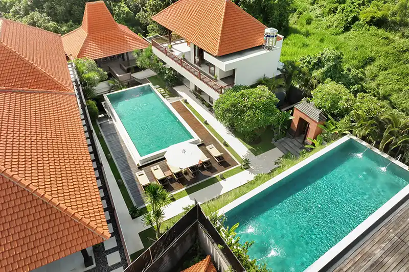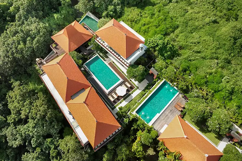 A grand 6-bedroom villa, comprises two distinct buildings. The first building houses four spacious bedrooms, while the second is home to an additional two bedrooms. Each bedroom has its own designated seating area. This layout offers expansive accommodation for up to 12 individuals, ensuring ample space and privacy for each guest.